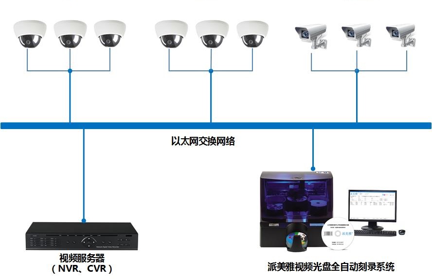 派美雅监控视频光盘打印刻录一体机可以通过网络与NVR、CVR等硬盘录像机设备相连接,也可以与庭审/审讯管理平台系统连接,实现视频数据自动下载、光盘自动按需刻录、打印一体化操作。