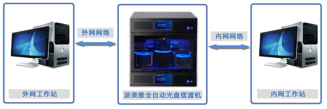 派美雅安全可信光盘摆渡机不带存储和服务器处理功能,具有100片光盘容量(50片输入/50片输出),内置1个刻录光驱,1个只读光驱,内外网严格物理隔离,保证数据单向传输,防止信息泄密。