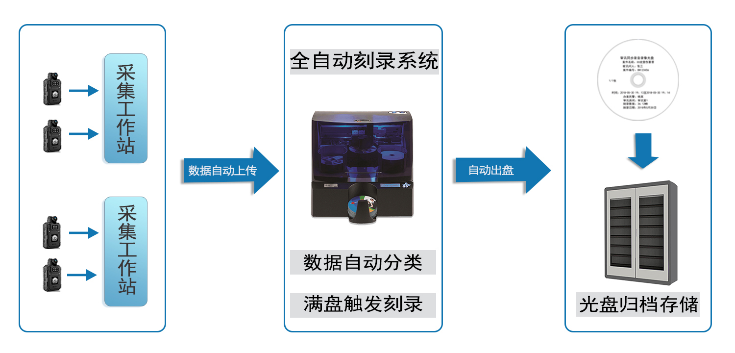 不依赖第三方数据备份恢复软件,不依赖特殊读取硬件设备!执法记录仪数据自动备份光盘刻录归档系统解决方案,为用户提供自主研发的国产光盘打印刻录一体机设备,搭配智能光盘管理柜、档案级蓝光光盘实现一站式CD/DVD/BD全自动光盘自动刻录存储归档方案,满足执法记录仪数据长期、安全归档存储需求。